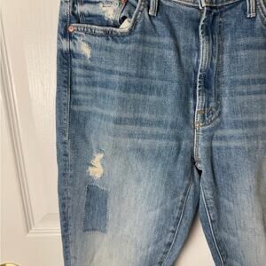 Insider Crop Step Fray. Mother's Insider jeans are a cropped style with patchwork accents and a frayed hem. Button closure