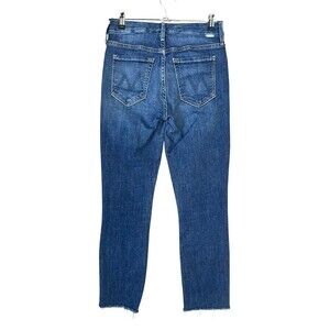 The product is a pair of Mother The Looker ankle fray jeans in women's size 26. These jeans feature a solid blue color with a medium denim fabric wash. They have a zip and button closure, are made of a cotton and elastane blend, and are machine washable. The design includes a 5-pocket design and stretch features, making them suitable for year-round wear in various seasons. The ankle fray style adds a trendy touch to these versatile jeans.