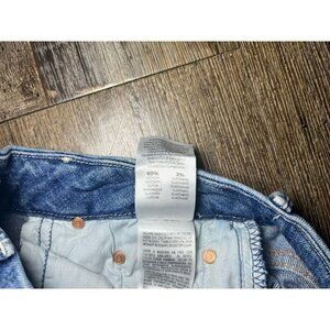 98% cotton, 2% elastane. Made in USA. Machine wash. Zip fly with button closure. 5-pocket styling. Destroyed details and light fading. Frayed hem.