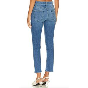 Mother's most popular mid-rise straight leg hits at the ankle with a clean hem. Cut from stretch denim, Wish On A Star is a mid-blue wash with whiskering and fading at the knees.