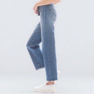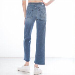 Mother high waisted jeans with a straight cut that skims the ankle. Patch pockets at front and back. Self tie waist belt. Made in USA.