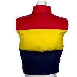 This Mother women's The Pillow Talk Tri Color Vest Jacket makes a statement due to it's sleeveless, mock neckline, cropped, snap front, pockets, puffer-style ripstop fabric and red/yellow/green blue striped design.