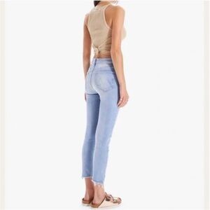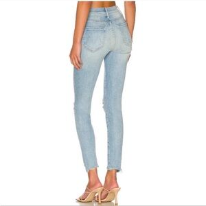 light wash high-rise skinny jean with an ankle-length inseam and a step-hem that's chewed in the back