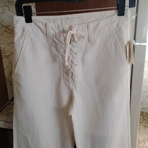 These Mother Denim The Tie Roller Prep Weekender iIn wash Return To Paradise are constructed in the USA in 70% Cotton/30% Linen Italian fabric They belt loops, front lace-up closure, front slash pockets, back welt pockets, high rise and wide flare sailor style lags. The eye-catching lace-up details elevate these crisp cotton-linen pants in a flattering wide-leg silhouette. These are coastal cowgirl, yoga retreat, Italian Summer, Vacation, beachy, Southwestern, winter whites, nautical, preppy vibes.