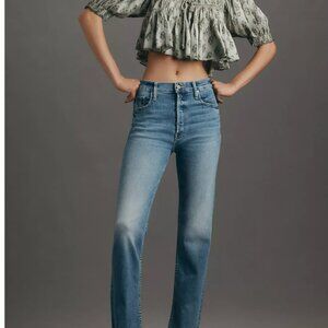 These are high-rise, cropped, straight-leg jeans featuring a raw, frayed hem and made from a comfortable, super-stretch denim blend. The "On The Road" wash is a classic, mid-blue denim with a light wash, featuring subtle whiskering and fading for a lived-in, vintage aesthetic. The jeasn have been worn just a handfulof times and are in very good conditions.