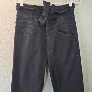 Solid Black color. Straight leg style. Regular fit. High rise. 4 pocket style. Zip and button closure. Fold over waist with waist tie.