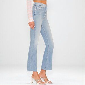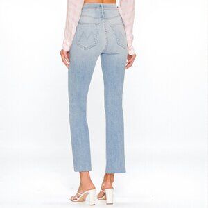 92% cotton, 6% poly, 2% elastane. Made in USA. Machine wash. Button fly. 5-pocket design. Light whiskering and heavy fading detail. Frayed raw-cut hem. 13" at the knee breaks to 14" at the leg opening. Revolve Style No. MOTH-WJ1205. Manufacturer Style No. 10326-360.