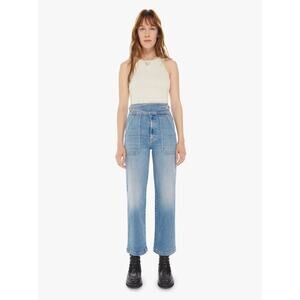Mother The Wrapped Up Patch Hi-Rise Ankle Straight Leg Jean in Let's Trip. Wanna go for a ride? High-rise straight-leg jeans with a buttoned wrapped waistband, patch pockets and a clean ankle-length hem. Cut from stretch denim, Let's Trip is a light blue wash with whiskering and fading at the knees. No turning back now. Excellent used condition.