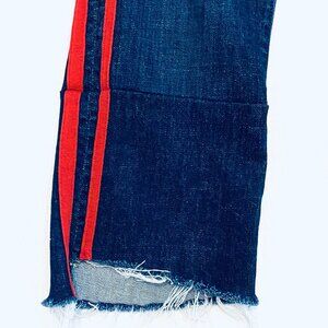 Luxury, stand out, racer, red stripe, stretch, straight leg, unique, frayed hem, asymetrical, weekend, date night, festival
