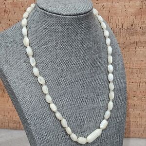 This exquisite necklace features polished mother of pearl beads in a luxurious creamy white hue. Each bead is unique, with an organic oval shape that adds to the necklace's vintage charm. The piece measures approximately 18 inches in length, showcasing a subtle iridescence that catches the light beautifully. The beads vary slightly in size, contributing to a gently graduated silhouette that rests comfortably at the collarbone. It secures with a simple and reliable clasp, ensuring it stays in place whether worn for casual outings or special events.