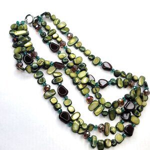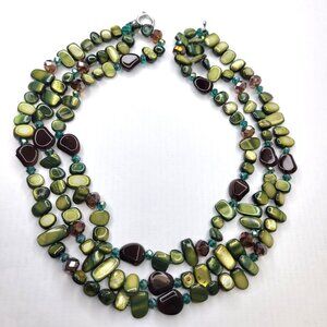 Mother of Pearl Bib Necklace in Green and Brown Shell Bead Chips Three Strand