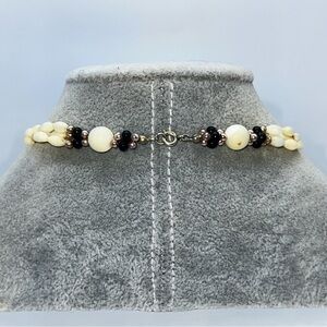 This stunning necklace features alternating sections of smooth cream-colored beads and elongated components adorned with dark geometric designs. Its medium length makes it a versatile accessory that can enhance any outfit. The unique combination of materials adds a touch of elegance and intrigue to your jewelry collection.