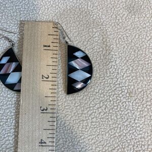 This is a pair of Semicircle Dangle Earrings. They were made in Mexico. They have a black background with Mother of Pearl Diamond shapes of white and pink inlaid,