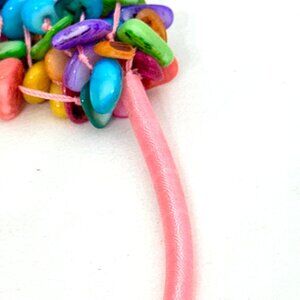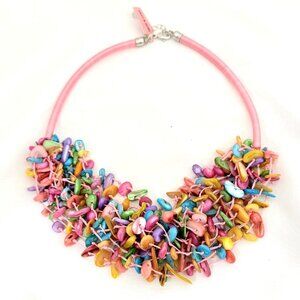 Very fun and colorful summertime/vacation/party necklace. Dyed Mother of Pearl is hand knotted on pink cord. Lobster clasp closure. Versatile necklace, not heavyweight. Length is approx. 18 inches plus 3" with the extender chain. New with tag.