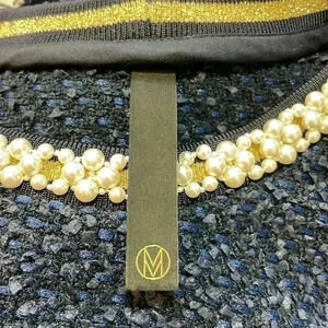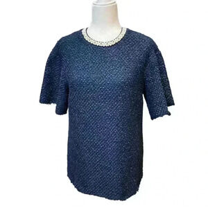 Preowned - Beautiful piece from the Spring 2017 Runway collection. Gorgeous Navy Blue Tweed with a Bright Blue Metallic woven in. Stunning Gold trim with Pearl Embellished Neckline. Gently worn, one Pearl looks to be missing. Has a Frayed hemline that has the classic elements!