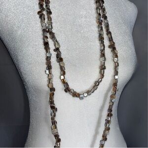Effortlessly elegant and naturally chic, this long strand necklace features iridescent square-cut shell beads in warm, earthy tones. With hues of taupe, cream, bronze, and pearl, this piece offers endless styling possibilities—wear it long, doubled, or even wrapped as a bracelet or layered choker.