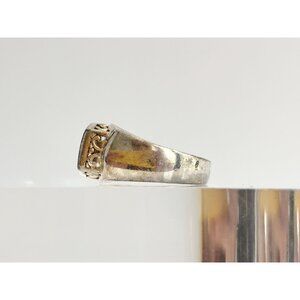 Mother of pearl sterling silver vintage ring. Center cabochon stone is bezel set. Tapered Shank. Cutouts along the head under the setting. Inner shank is marked as sterling, tested positive as such via chemical testing.