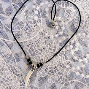 Cute Mother of Pearl horn amulet necklace with black and silver tone.