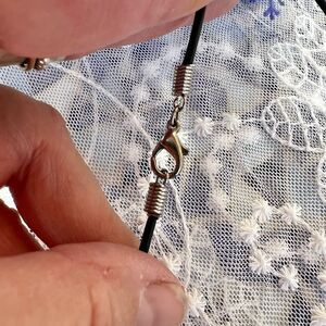 Shimmery mother of pearl pendant with black rubber cord and beads, along with silver tone beads and findings, 19" with lobster clasp.