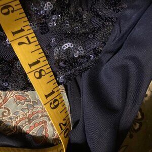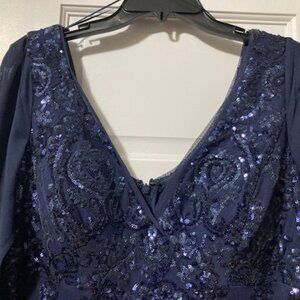 Beautiful R & M Richards special occasion dress. Zip closure; v-neck with beautiful drape in back. Navy blue with navy sequins, lined. Dress is 59" long; 18.5" across the chest pit-to-pit; 18" across the front waist. Dress has some stretch to it. Elegant and has a wonderful flow. Non-smoking home. Very flattering.