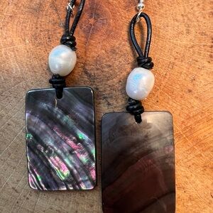 Handcrafted mother of pearl, fresh water pearl, leather and sterling earrings. One of a kind.