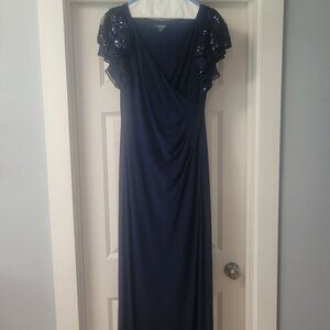 Navy blue, medium low cut, maxi dress. Cap sleeves with a few sequins, slit on left side. Very classy! I received lots of compliments. Worn once and dry-cleaned.