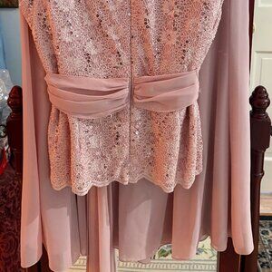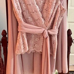 Alex Evenings Mother of Bride 2 piece (long skirt & cap sleeve top) - zips up back in dusty pink. Top is a cottony lace V-wrap look with occasional sequins dotting the top overlaying polyester lining with a long sash belt/tie. Skirt has elasticized waist. New- Never worn- Size XL polyester