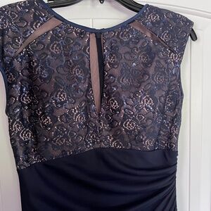 Lightweight, comfortable formal dress features empire waist and tasteful drapes and shirting.