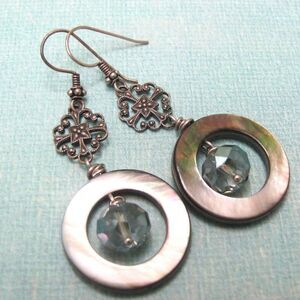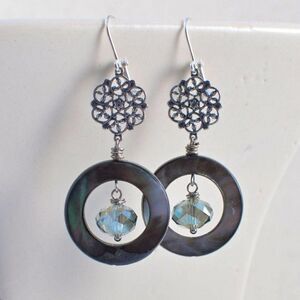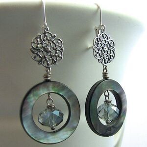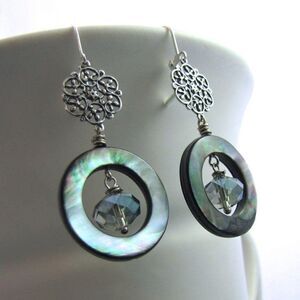 These elegant earrings are Mother of Pearl rings hung from beautiful silver filigree. Accenting the center of each hoop is a lustrous faceted Czech glass rondelle. Hung on silver plated, lever back ear wires.