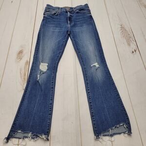 Really cool Mother "The insider crop" step hem jeans! Slight flared leg with natural distressing and a chewed hem. In excellent condition, size 26.