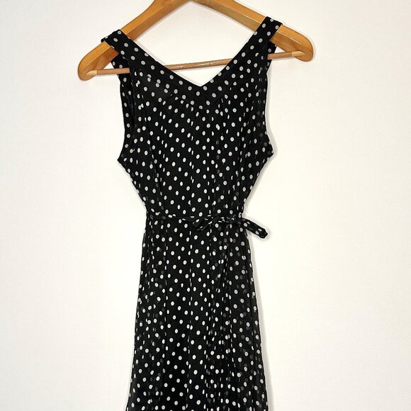 Sleeveless, v-neckline, wrap silhouette, polka dot print, black, midi-calf length, lined