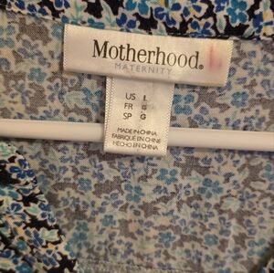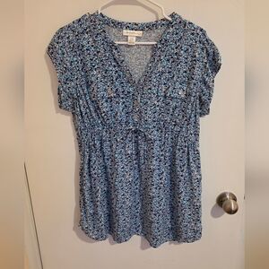 Motherhood Maternity Blouse Large Blue Floral Short Sleeve Top Waist Tie Pockets