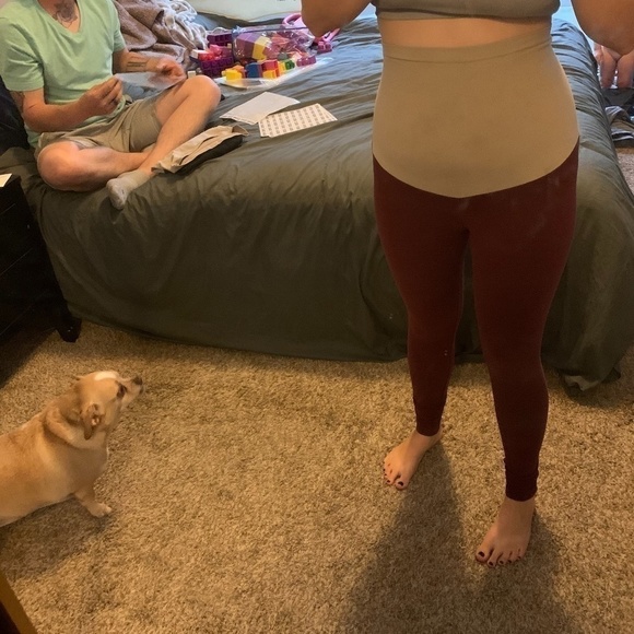 Motherhood Maternity Burgundy Leggings With Full Tan Panel Size Small. Soft and cozy material and super stretchy! Really comfortable! Well worn, but plenty of life left!