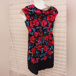 Motherhood Maternity Dress Black with Red Floral Size M. This dress is super cute for the expecting mom to be. Gently used, no visible imperfections. Zipper back works perfectly. Material 97 % Cotton, 3% Spandex. Machine washable, cold. Tumble dry, cool iron if needed. Made in Vietnam.