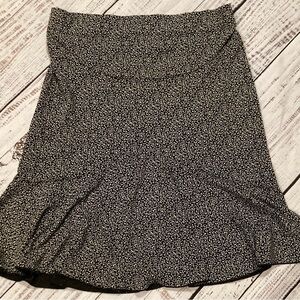 Stretchy and comfortable with a panel that makes room for your growing belly! It is hidden with the same fabric as the rest of the skirt. In excellent preworn condition with no flaws. Black with tan design.