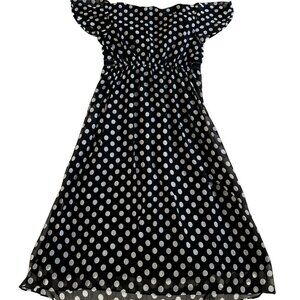 This lined dress works for any stage of pregnancy through breastfeeding and beyond. This dress has black and white polka dots on the top sheer layer with a light all black lining. It's 100% polyester with an elastic high waist. Size Small