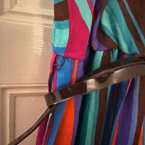 This casual sundress by Motherhood Maternity features a vibrant green and red striped pattern, perfect for resort wear. The sleeveless design with a V-neckline and a defined waistline offers a flattering fit, while the lightweight fabric ensures comfort in warm weather.