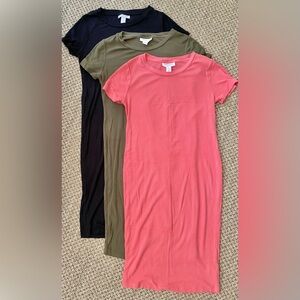 Three ribbed bodycon dresses by Motherhood Maternity. Soft and stylish for comfort. Colors: black, olive, coral/pink.