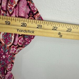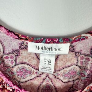 This Motherhood Maternity sleeveless tunic top in size XL features a vibrant retro tile print in shades of pink, coral, and teal. Made of 100% rayon, it's lightweight, breathable, and perfect for warmer weather. The scoop neck, elastic waist, and subtle high-low hem create a flattering silhouette with room to grow. Great for casual wear, lounging, or layering.