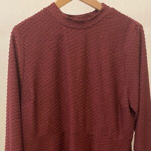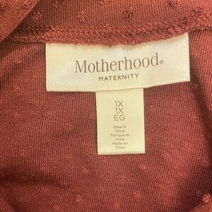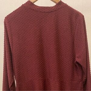 Motherhood Maternity Top / Blouse, Swiss Dots, Maroon / Burgundy, Peplum, Stretchy, Size 1X. Preowned. Gently worn. Underarm to underarm measures approx 21” across. This pretty top is perfect for career, casual, business, or dressy.