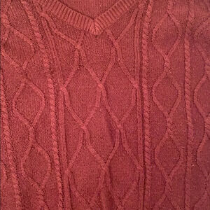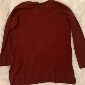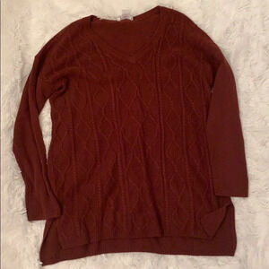 Beautiful long tunic style cable knit sweater in good condition. It has minor piling but still plenty of life. I purchased new and absolutely loved wearing it with leggings and booties. Burgundy in color