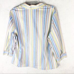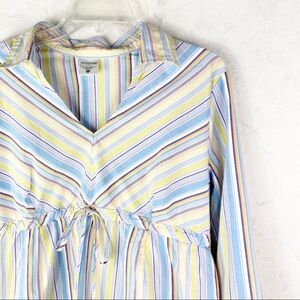 Motherhood Maternity Stripe V Neck Shirt. 3/4 Sleeve. Drawstring Scrunched Tying Belly. Green & Blue, Navy Colors. Loose & Lightweight. Cute & Comfy. No Stains or Rips.