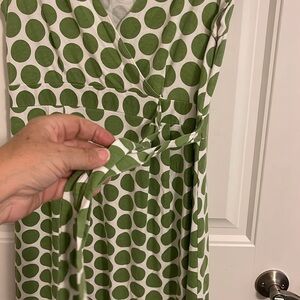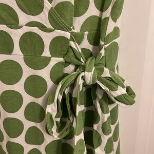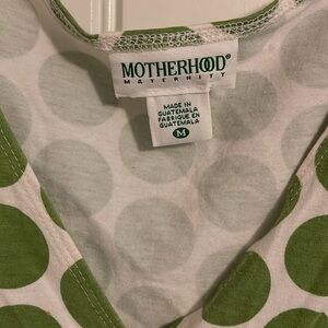 Motherhood Maternity size Medium white dress, pistachio green dots allover pattern faux wrap short sleeved dress. Elastic waist at the back adjustable tie at front sidemidi length.