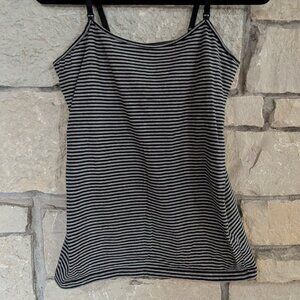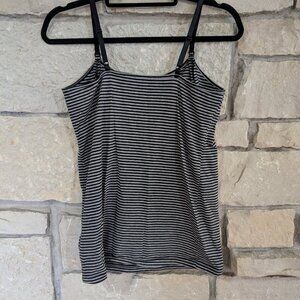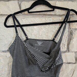 Black and gray striped cami for nursing. Adjustable straps, shelf bra, fold-down front for easy feeding.