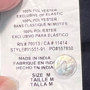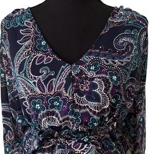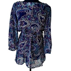 Motherhood Maternity flowy semi-sheer blouse with integrated camisole size Med. Colors include navy, purple, and teal and the sash allows you to cinch to your comfort. V neckline, 3/4 length sleeves with button, navy camisole attached at shoulders. Please see photos for details. Great with slacks or skirt for work and leggings or jeans for play.