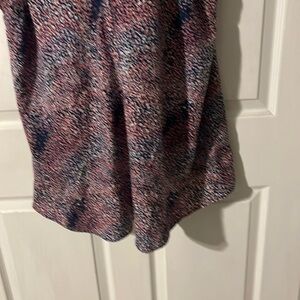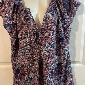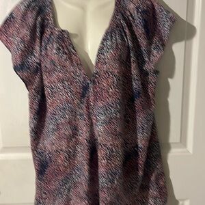 Chic V-neck blouse with a pink and blue pattern. Flattering and stylish for any occasion.