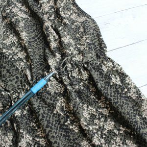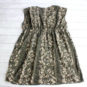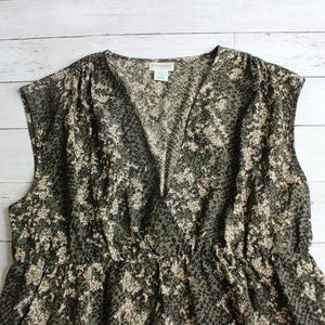This silky dress is army green, khaki green and beige tan with an animal print. It has a cross over wrap front with thin elastic empire waistband with side pockets. It is short in length and could also be worn as a tunic top with leggings. The dress has belt loops however it does not include a belt. It is in excellent near to new condition.
