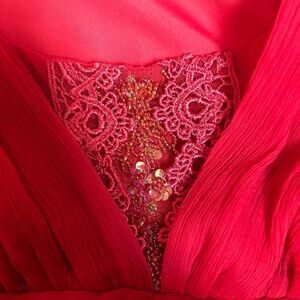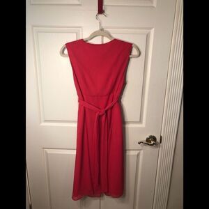 Motherhood Maternity fancy dress with sequin inset and tie waist, color is between a pink and a coral