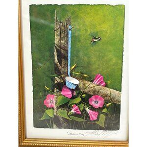 A serene hummingbird and morning glory flower scene titled "Mother's Day" by Billy Montag, elegantly framed in ornate gold, ready to elevate any space.