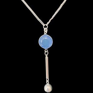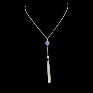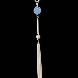 A chic, modern necklace featuring a faceted blue gem, silver-toned chain, and elegant tassel charm. Perfect for casual or dressy occasions.